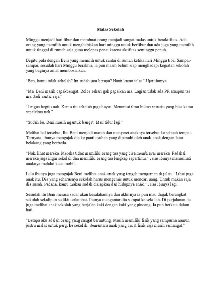 Malas Sekolah Anggi Rosalina - Kelas XI MIA-2 Minggu menjadi hari lubur dan membuat orang menjadi sangat malas beraktivitas. Cerpen Pendidikan Kegiatan pendidikan adalah aspek penting dan sangat vital dalam kehidupan umat manusia baik secara individu maupun kolektif. Penyampaian narasi seperti itu akan semakin menarik dengan dijadikan sebuah cerpen.