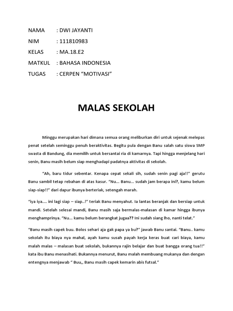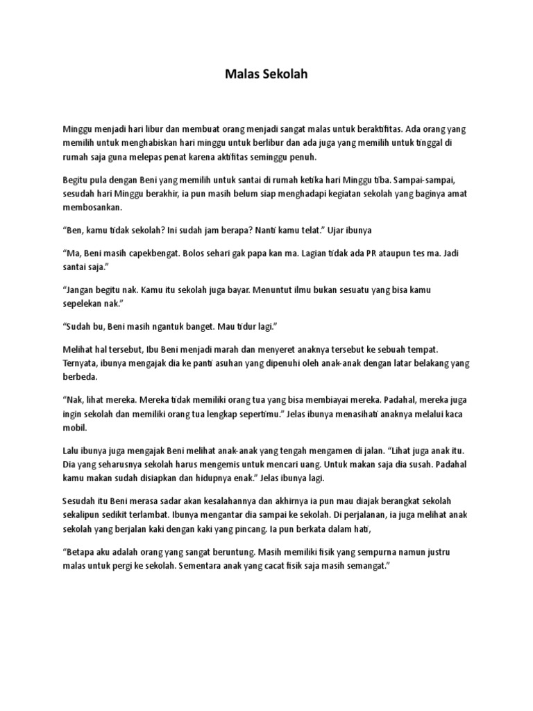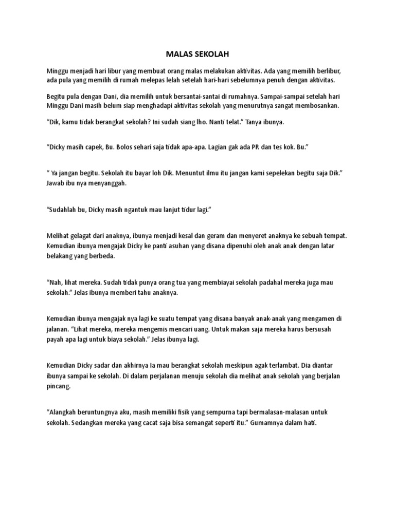Malas Sekolah Cerpen Karangan. Biasanya di dalam cerpen berisi tentang tokoh dan karakter yang sangat melekat dengan kehidupan peserta didik. Untuk makan saja mereka harus bersusah payah apa lagi untuk biaya sekolah.